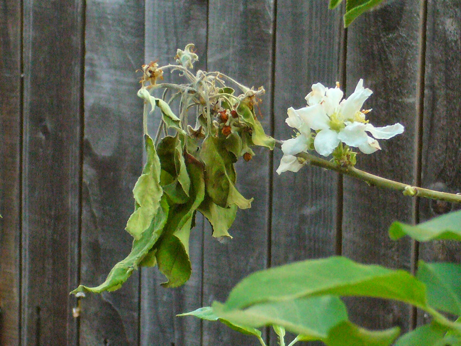 This disease is called Fire Blight because it looks like leaves and fruit have been hit with a blow torch. The first sign of a problem is wilt. The leaves then turn a none-too-pleasant shade of brown, before fading to black. Fire Blight also spreads like wildfire.